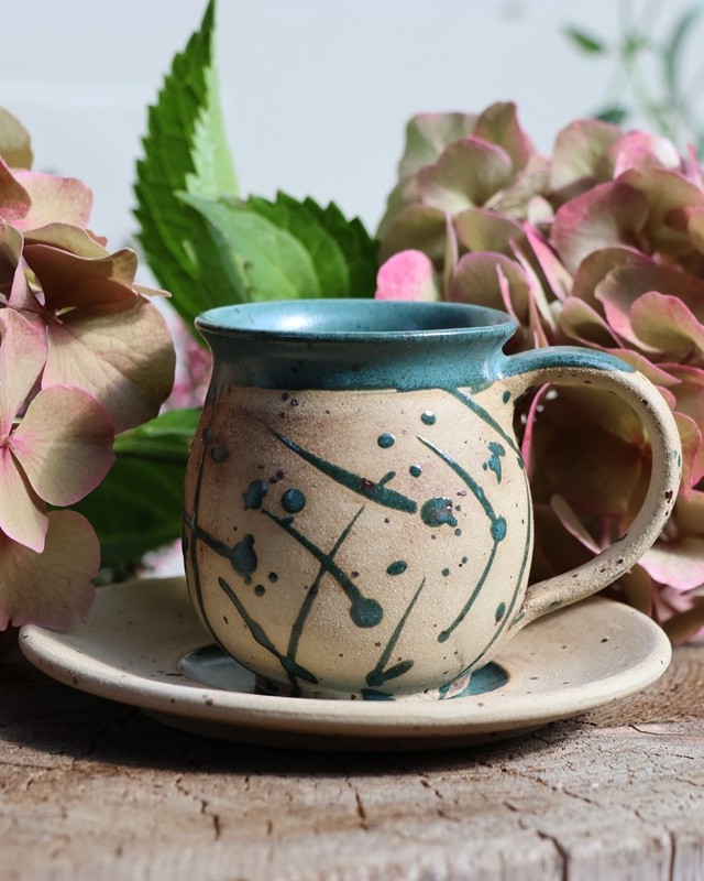 Die­se Espres­so­tas­se mit Unter­tel­ler wur­de in der der Töp­fe­rei Alte Schmie­de, Schier­ke hand­ge­töp­fert. Jedes Stück ist ein Uni­kat
