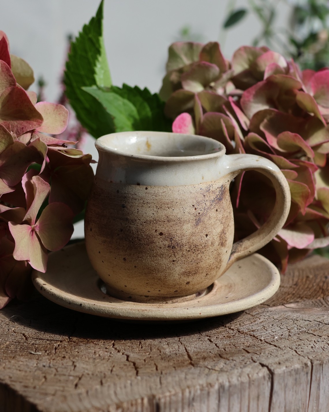 Handgetöpferte Tasse erdig mit Unterteller