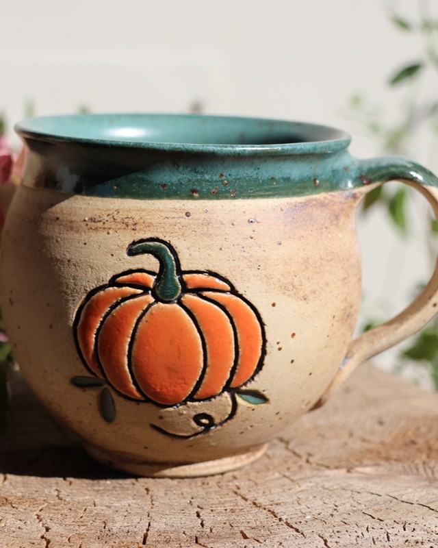 Handgetöpferte Tasse mit Kürbis