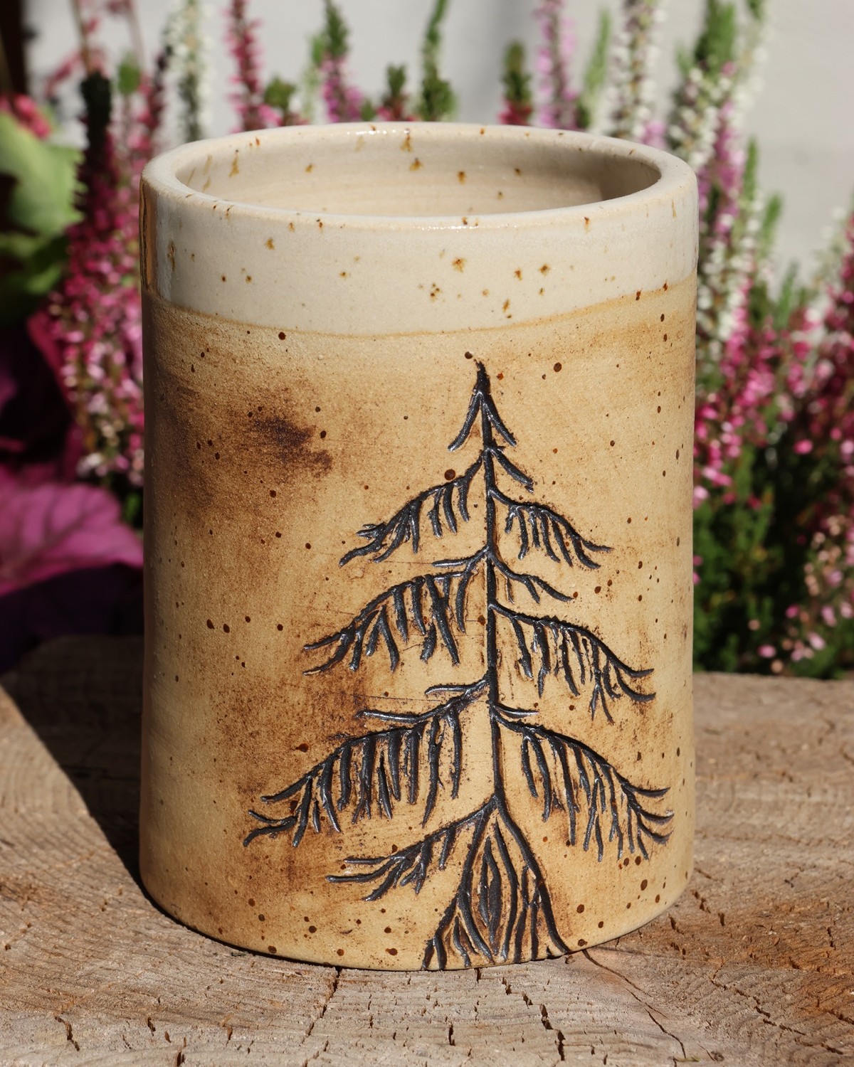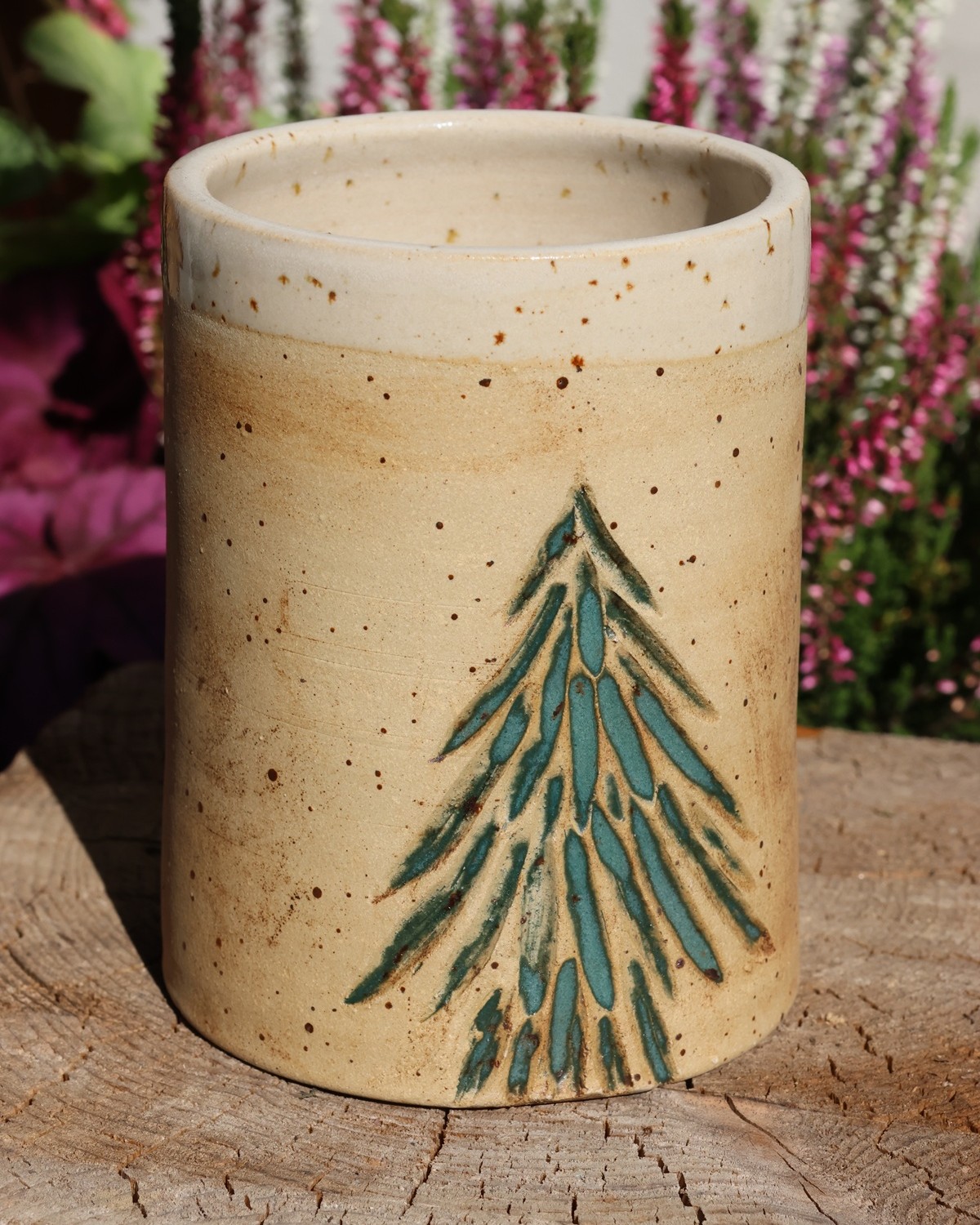 Die­se Vase mit Bäu­me wur­de in der der Töp­fe­rei Alte Schmie­de, Schier­ke hand­ge­töp­fert. Jedes Stück ist ein Uni­kat